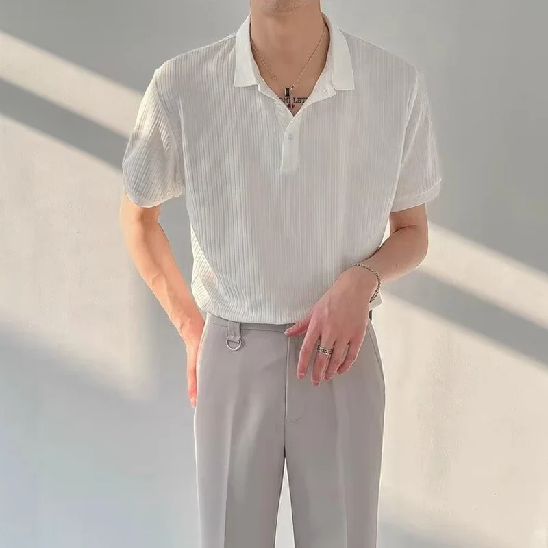 Crafted for the discerning gentleman, this ribbed short sleeve knit tee features a lapel collar and a buttoned front, combining style and comfort effortlessly. Its slim fit design enhances your silhouette, making it perfect for any fashionable occasion.